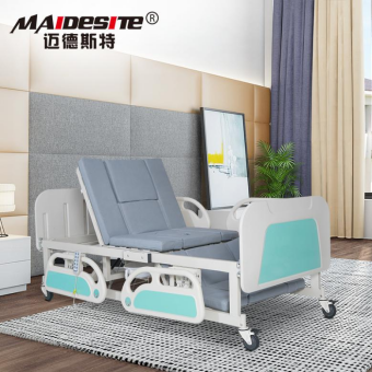 首先,多功能电动护理床,能让使用者通过枕边的手控器进行背、脚体位高低顺意调节、方便灵活地进行水平升降,避免由于长期卧床而产生褥疮,有助于早日康复;